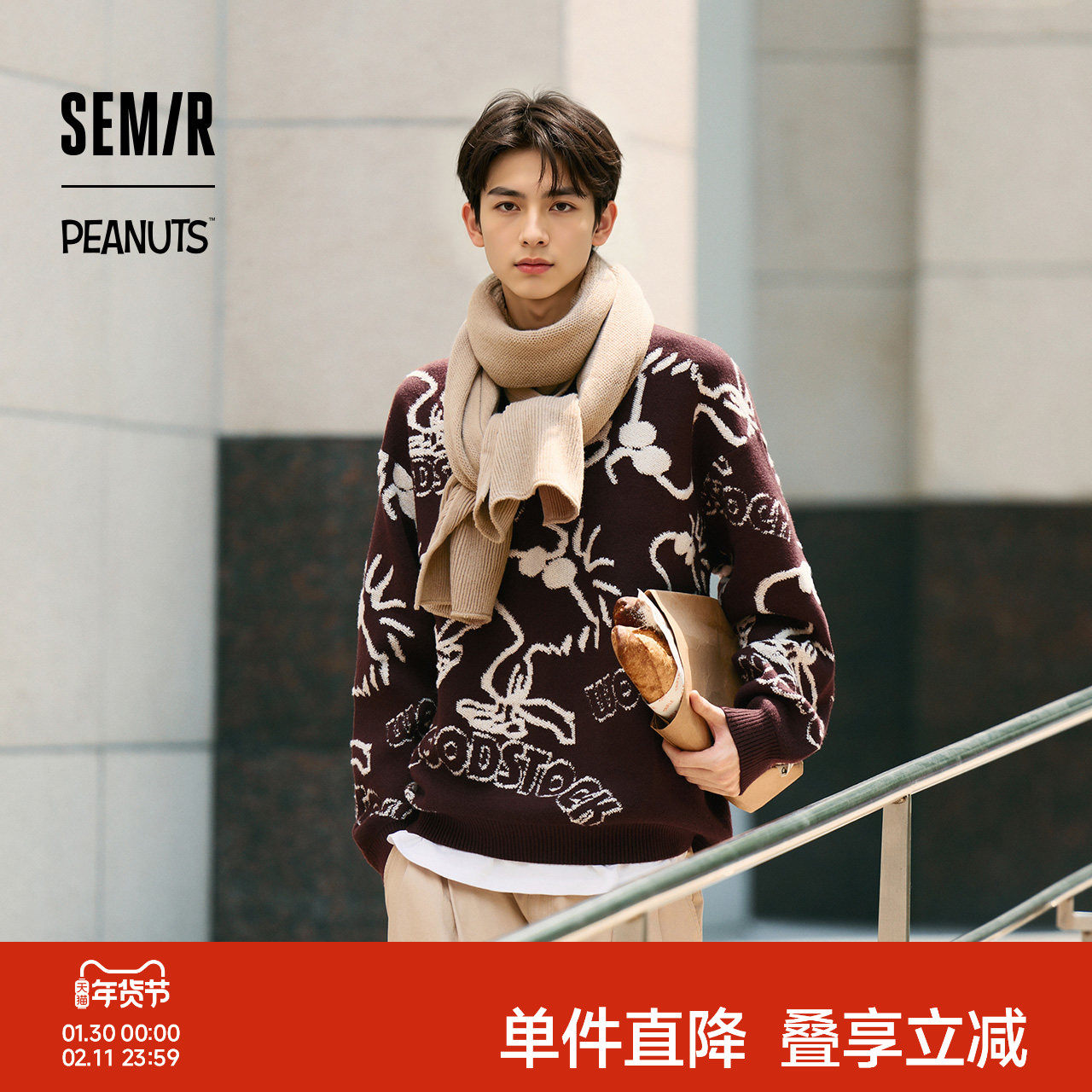 森马史努比系列毛衫男冬季满版提花针织衫撞色情侣毛衣宽松套头衫