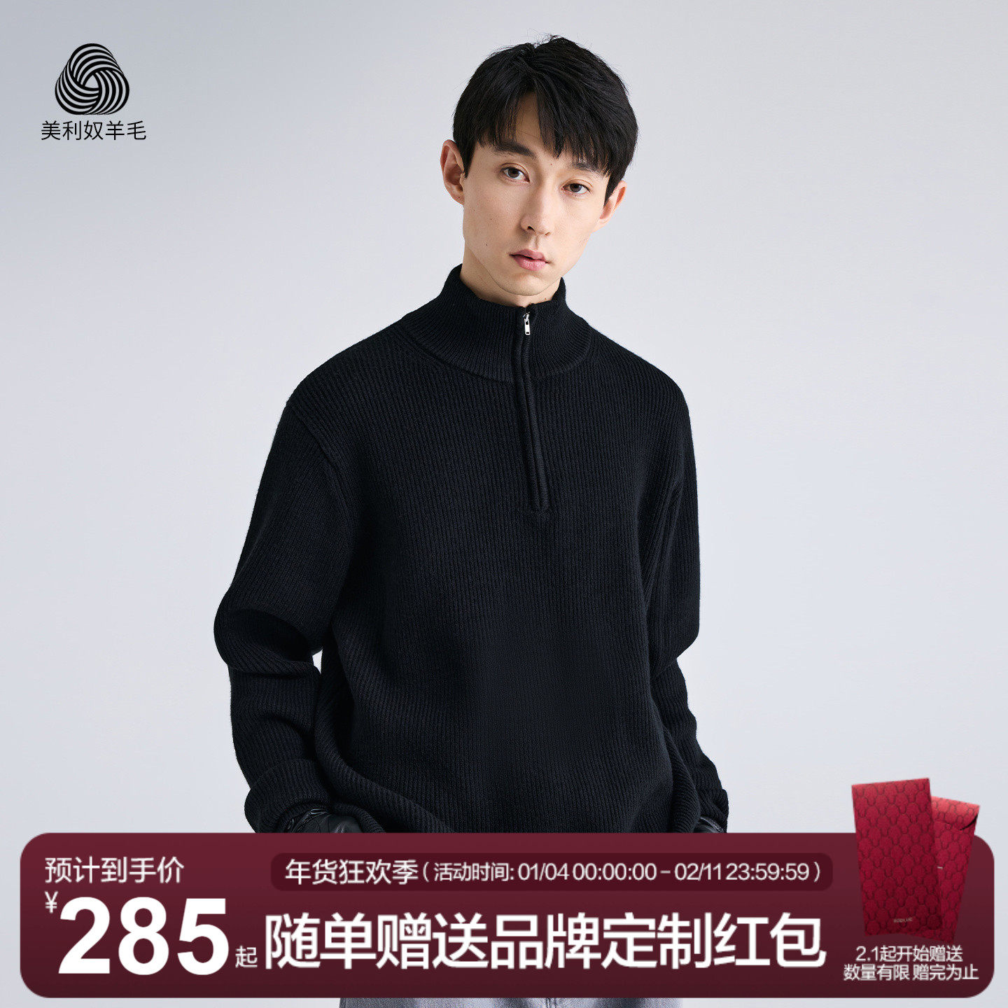 [100%绵羊毛/软糯保暖]梦特娇冬季男士红羊毛衫翻领针织休闲毛衣J