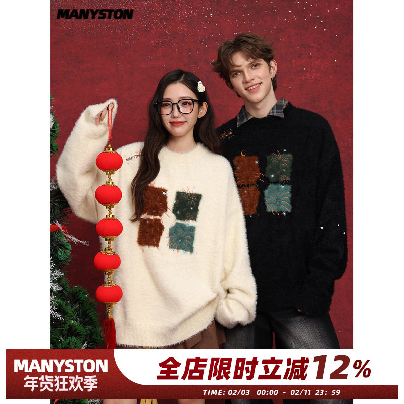 MANYSTON美式复古刺绣毛衣男款冬季情侣款圆领宽松保暖针织衫上衣