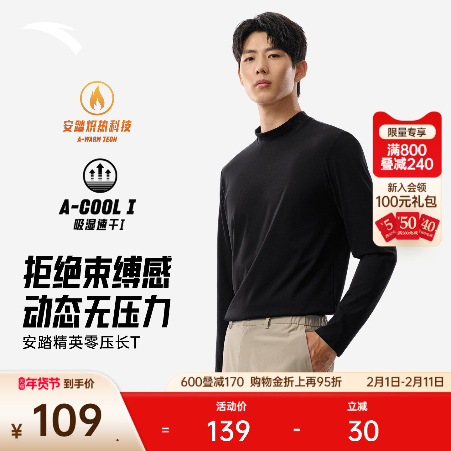 安踏零压T丨加绒半高领长袖t恤男装冬季简约风通勤圆领打底衫上衣